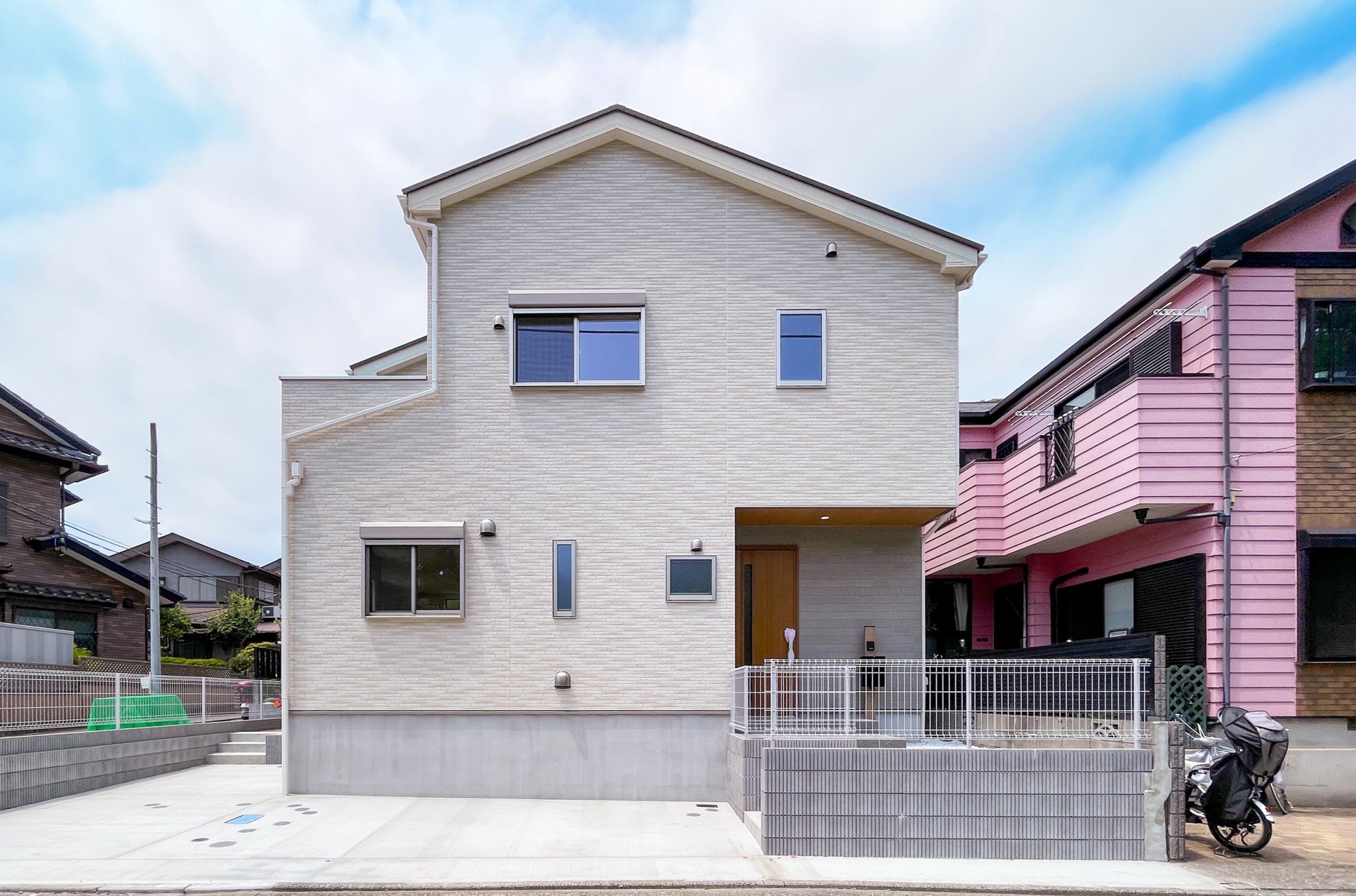 外観は白い外壁と木目のサイディングが優しい雰囲気を演出。