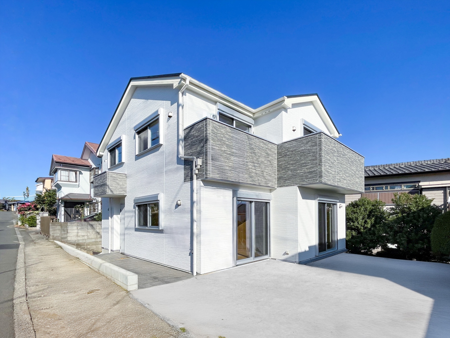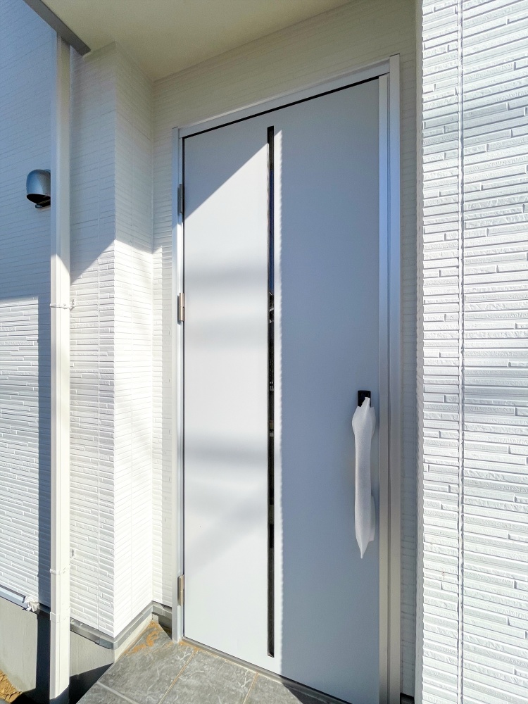 ホワイトを基調とした外壁と、玄関ドアもホワイトに統一した明るく清潔感のある外観デザインが魅力。