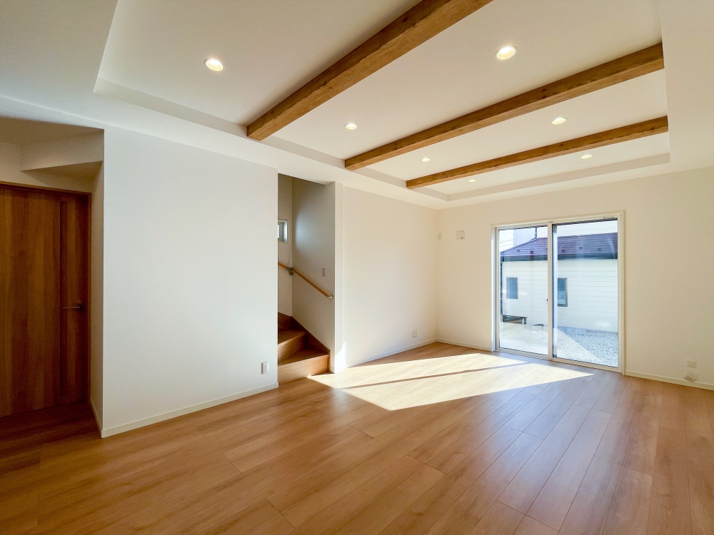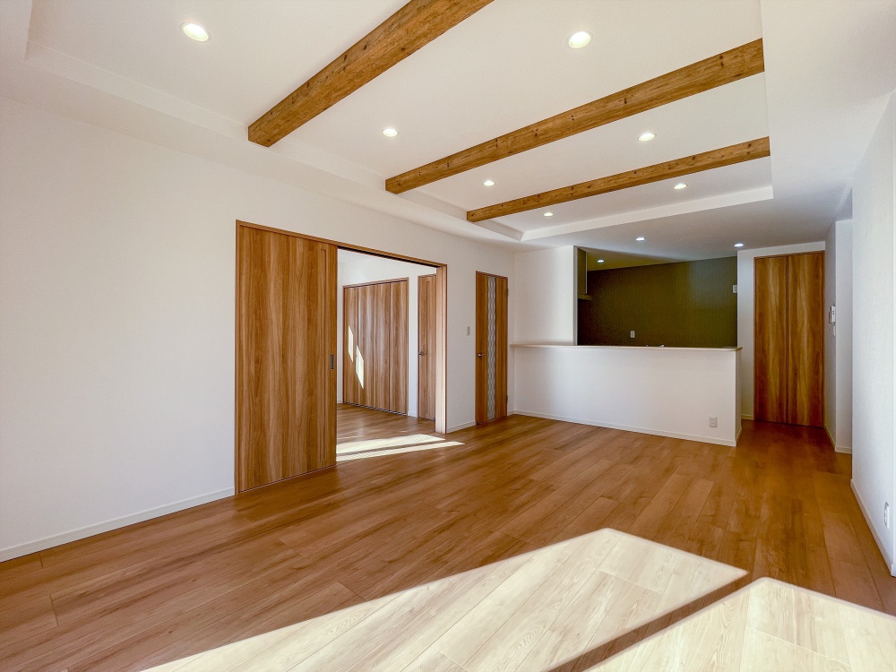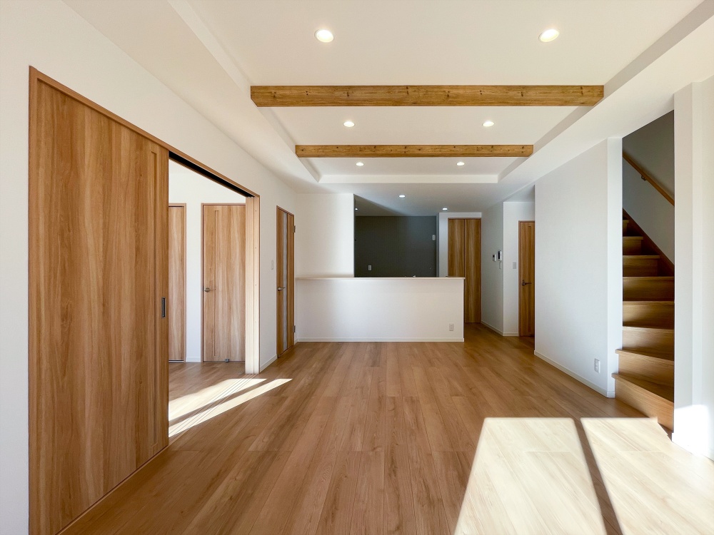 リビングは梁を活かしたデザインで空間に立体感と温もりをプラスしたゆったり設計の5LDK。